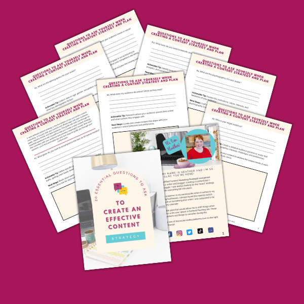 Sign up to my email list and get my FREE PDF of the questions to ask yourself when developing a content strategy and plan to create and promote awesome content your audience loves!