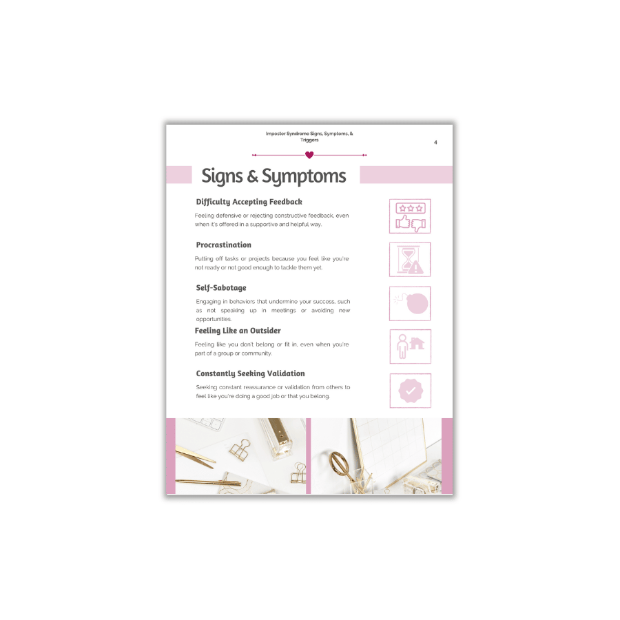 Knowing the signs and symptoms of imposter syndrome is a game-changer, empowering us to recognize and overcome its grip. Don't let imposter syndrome hinder your success. Grab this freebie now and reclaim your confidence.
